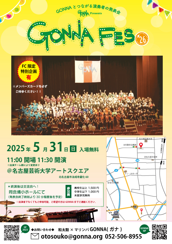 GONNAのレッスンは、定期開催の和太鼓・マリンバ教室と、